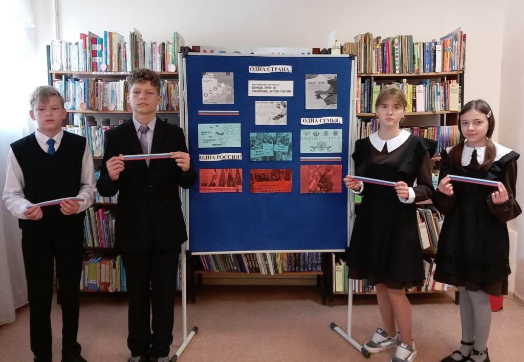 В День воссоединения Донецкой и Луганской народных республик, Запорожской и Херсонской областей с Россией в Центральной детской библиотеке проведен патриотический час «Одна страна, одна семья, одна Россия».